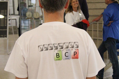 Angehörige des Fachbereichs Biologie, Chemie, Pharmazie wiesen sich mit einem speziellen T-Shirt als Ansprechpartner für die Erstsemester aus.