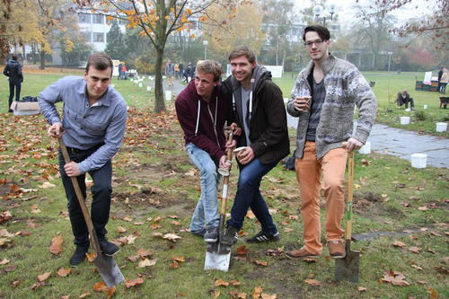 Eigentlich waren die vier Jurastudenten gerade auf dem Weg in die Bibliothek, als sie auf Blumenzwiebeln, Schaufeln und Spaten neben der Mensaterrasse aufmerksam wurden. „Es war unser erster Besuch in der vegetarischen Mensa, und wir dachten uns: Wenn wir schon eine ökologische Mittagspause machen, dann richtig“, erzählen Fritz und seine Kommilitonen. Anstelle eines Fleischgerichts gab es für die spontanen Gärtner Bienenstich, der vom Mitarbeiter des Studentenwerks und Hobby-Imker Jürgen Spethmann spendiert wurde. Auch die chinesischen Doktoranden Yun und Qi haben tatkräftig mitgeholfen: „Wir wollen damit etwas hinterlassen – für die Umwelt und als Erinnerung an unsere Studienzeit hier.“
