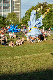 Imkermeister Benedikt Polaczek präsentierte einen Freiflugkasten für Bienen und Hummeln – und konnte so auch zunächst zurückhaltende Besucherinnen und Besucher dank Sicherheitsabstand zum Insektenbeobachten einladen. Nach der Verkostung des hauseigenen Honigs lud Japanologieprofessorin und Vizepräsidentin Verena Blechinger-Talcott nach Japan ein: Bei Mugicha – Gerstentee – und Matcha-Keksen erklärten Studierende die Origami-Faltkunst und zeigten, wie ausländische Namen in Katakana, einem japanischen Schriftsystem, geschrieben werden. „Aus Günter müssen wir leider Ginter machen“, meinte Blechinger-Talcott scherzend zum Präsidenten, „denn ein ‚ü‘ kennt das Japanische nicht.“