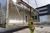Vor etwa einem Jahr, im vergangenen Oktober, hingen die Laborräume noch an einem großen Kran in der Luft – wenige Monate später waren sie schon in Betrieb: Die 45 Mitarbeiterinnen und Mitarbeiter zweier Arbeitsgruppen der Organischen Chemie, der Gruppen von Professorin Beate Koksch und von Professor Christoph Schalley, konnten in den neuen, teils dreistöckigen Modulbau mit 530 Quadratmetern Grundfläche einziehen.