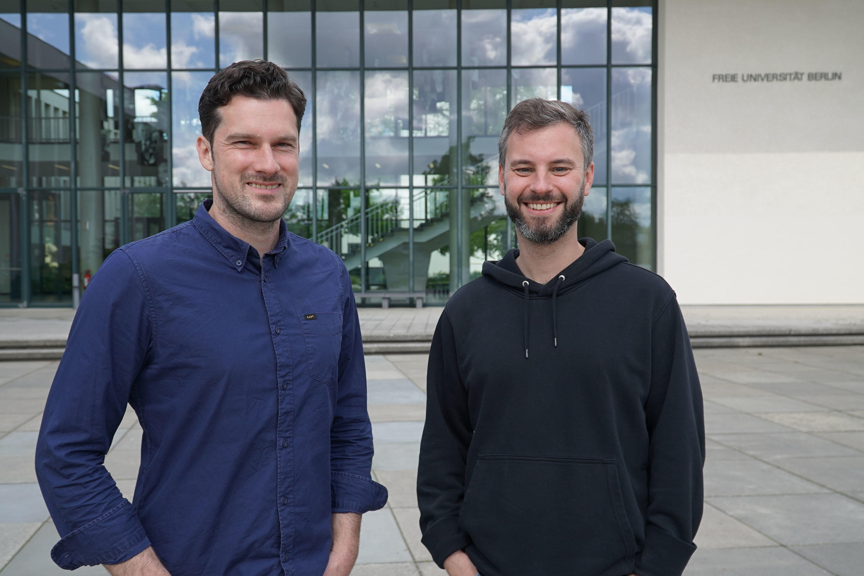 Tobias Kilgus (links) und Peter Kompiel (rechts) aus dem Team der Universitätsbibliothek haben gemeinsam mit Marc Altmann und Christian Horvat (beide nicht im Bild) das Transkriptions-Tool ASR4-Memory entwickelt.
