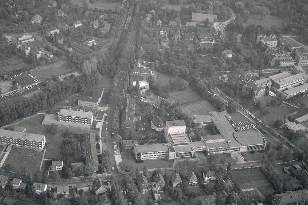 Aerial view of Freie Universität's campus in Dahlem. From left to right: The Institute for East European Studies, the Otto Suhr Institute, and the building complex that houses the Henry Ford Building and the University Library