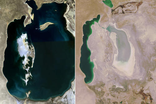 Once one of the world’s largest lakes, Central Asia’s Aral Sea held a lot of water as recently as summer 1989 (left). The photo at right shows what was left of the lake in October 2008.