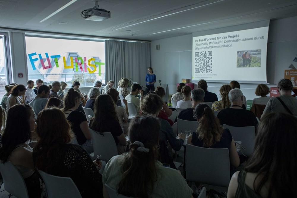On Thursday, June 19, 2025, the 4th FUturist Midterm Event took place from 2 to 6 p.m. in the “Holzlaube,” where Dr. Jana Gerlach, Prof. Dr. Daniela Niesta-Kayser, Anselm Denfeld, Paulina Bienioschek, Eva Glomski, Antonia Schildhauer, and Carolin Clara Missihain presented their respective interim results to a mixed audience in five minutes.