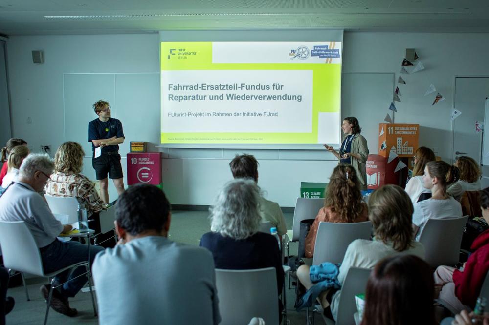 Immerse yourself in the world of diversity and equality with FUFLINTAΦ, which promotes the visibility of women and FLINTA individuals in physics and advances an inclusive scientific culture. Experience how “Nachhaltig WIRksam” strengthens democracy by combining science communication and social cohesion. Discover the bicycle repair and reuse center, which conserves resources and promotes conscious mobility. Meet the rain barrel heroes who save water and protect trees on campus through cooperation strategies. And finally, be inspired by “Rasenmäääher” (lawn mowers), who promote biodiversity with sheep and rethink sustainable green space maintenance.