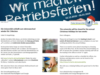 the Freie Universität Berlin will be closed for the annual Christmas Holidays from 22nd of December 2018 to 6th of January 2019. Please take notice of the documents linked below.