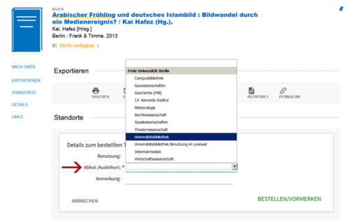When you place a request, you can specify to which Freie Universität library you want to have it delivered for you to take out on loan. (Exception: You cannot have items delivered to the Philological Library). There is a list of the possible pickup locations in the request form.