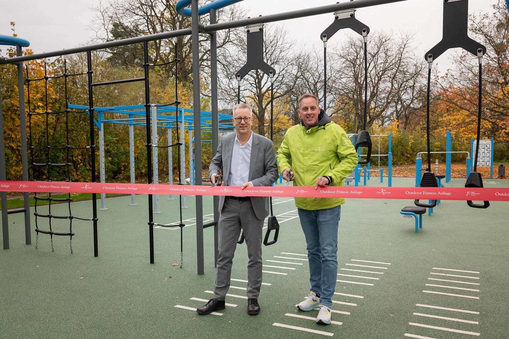 Universitätspräsident Prof. Dr. Günter M. Ziegler (links im Bild) und der Direktor der Zentraleinrichtung Hochschulsport Christian Mundhenk eröffnen Outdoor-Fitnessanlage an der Freien Universität Berlin