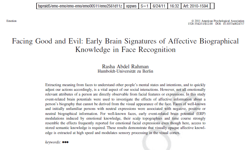 Abdel Rahman, R. Facing good and evil: Early brain signatures of affective biographical knowledge in face recognition. Emotion. |