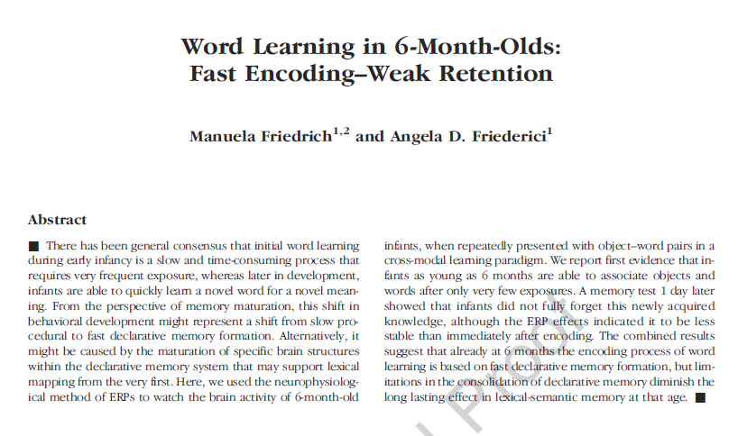Friedrich, M., Friederici, A.D. Word learning in 6-month-olds: Fast encoding – weak retention. Journal of Cognitive Neuroscience. |