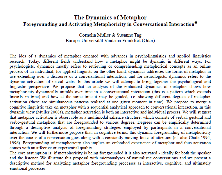 Müller, C., Tag, S. The Dynamics of metaphor. Foregrounding and activating metaphoricity in conversational interaction. Cognitive Semiotics (Special Issue No 6, Spring 2010). |