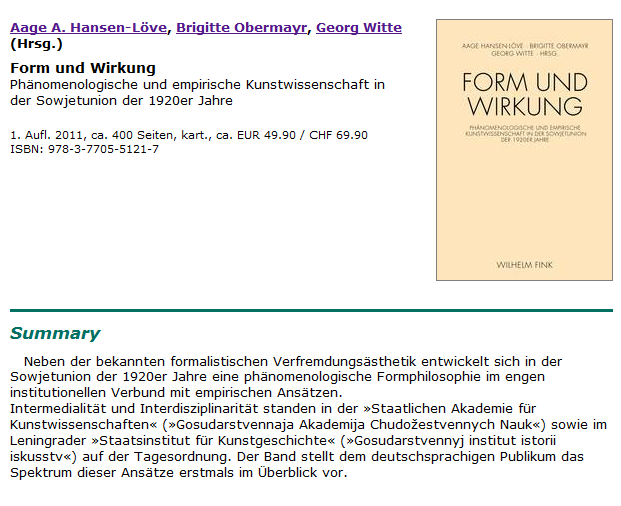 Witte, G. Die Emotionen der Kunst. Zur psychologischen Ästhetik in der frühen Sowjetunion (Vygotskij, Ejzenštejn, Bernštejn, GAChN). In: Hansen-Löve, A, Obermayr, B., Witte, G. (Eds.). Form und Wirkung. Phänomenologische und empirische Kunstwissenschaft in der Sowjetunion der 1920er Jahre. München: Fink. |