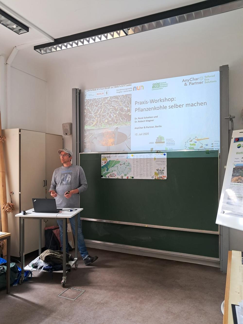 Pflanzenkohle kann im Garten einen wichtigen Beitrag für eine verbesserte Fruchtbarkeit und Wasserspeicherfähigkeit des Bodens leisten. Gleichzeitig bindet sie Kohlenstoff und kann Schadstoffe filtern. Beim 2. Runden Gartentisch Kleingarten 2025 am 15. Juli konnten Gartenfachberater:innen, Kleingartenanlagen-Vorsitzende und interessierte Einzelpersonen aus Kleingärten in Steglitz-Zehlendorf lernen, wie man aus Totholz und verschiedenen Biomassen Pflanzenkohle selber herstellen kann und was beachtet werden muss, um eine gute Qualität zu erzielen. Hochwertige Pflanzenkohle kann in vielfältigen Anwendungsgebieten eingesetzt werden, z. B. in der Eigenkompostierung.