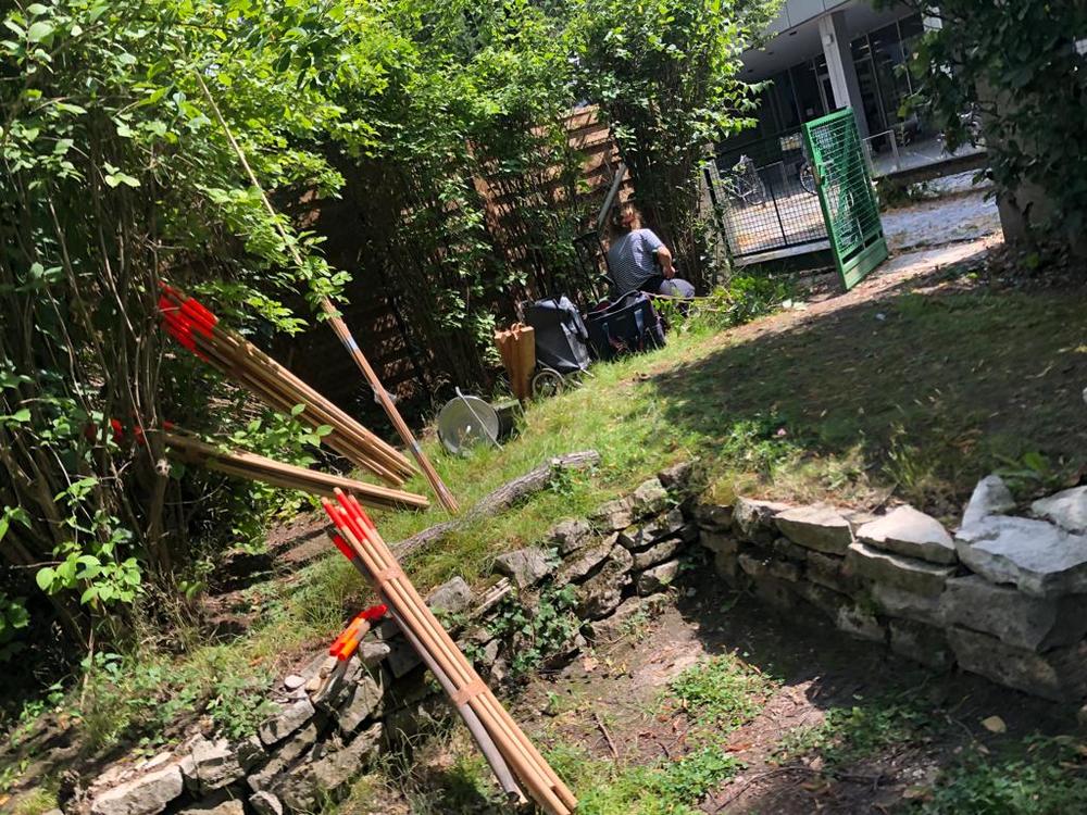 Die Rauminstallation setzt sich aus 53 neuen und alten Besenstielen zusammen. Diese schafft einen räumlichen Dialog zwischen dem etwas versteckten Garten, unserer Universität, dem Kino und der Nachbarschaft. Die Besen wurden spalierartig zusammengesetzt und in den Himmel gehoben. Im Zusammenspiel der unterschiedlichen Besenstiellängen, der krummen und geraden Formen, der Holztexturen und Farbe entsteht eine rhythmische Bewegung. Diese lädt ein, neugierig einzutreten und den Garten in all seiner wilden Vielfalt zu entdecken.